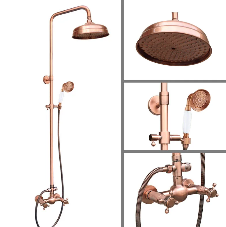 Antique Red Copper Brass Dual Cross Handles Bathroom 8" Round Rain Shower Head Faucet Set Bath Mixe